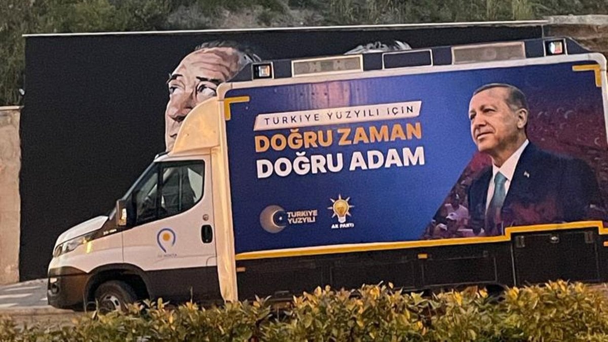 AKP İl Başkanlığı, Atatürk ve İnönü resmi bulunan panonun önüne Erdoğan’lı seçim otobüsünü çekti.