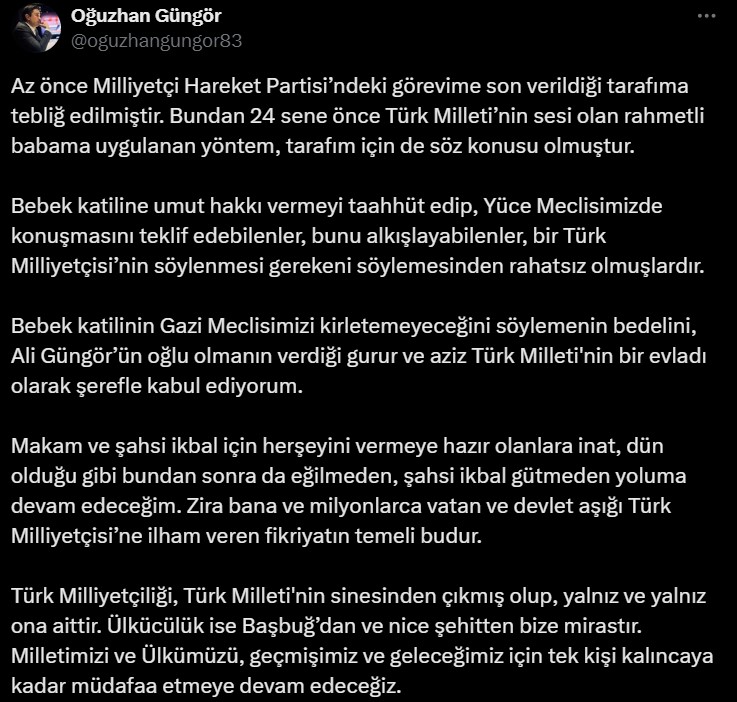 MHP TBMM Grup Danışmanı olarak görev yapan Oğuzhan Güngör, MHP Genel Başkanı Devlet Bahçeli’nin Abdullah Öcalan çağrısını eleştirdiği için görevden alındığını duyurdu.
