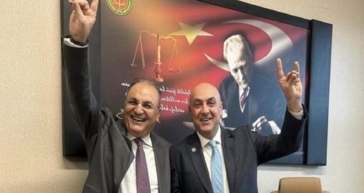 Ankara İki Nolu Baro Başkanı ile bozkurt işareti yaparak poz veren,