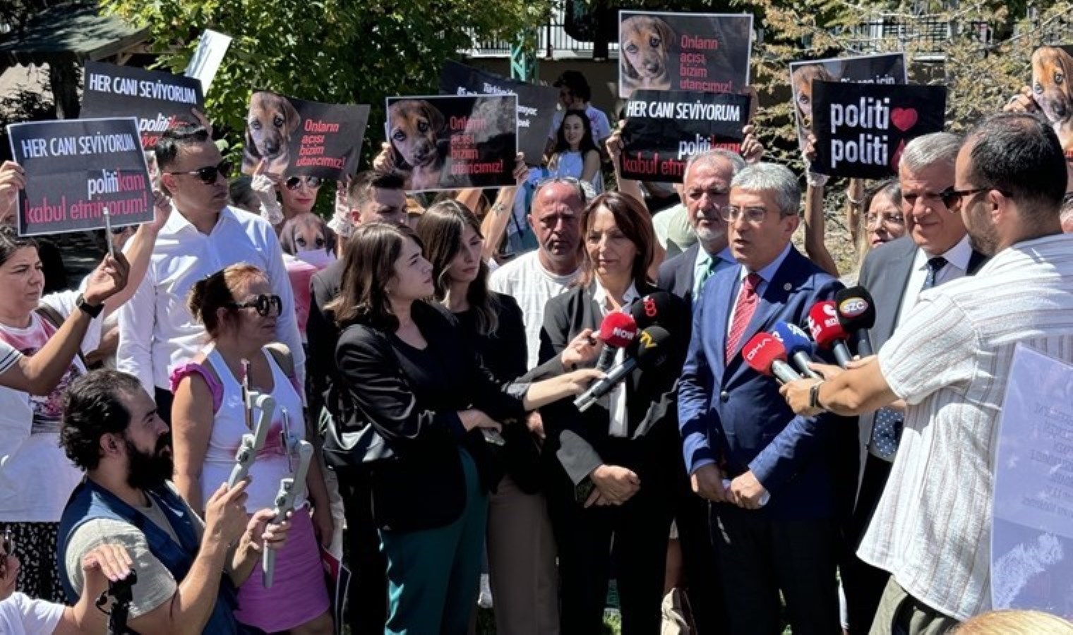 ‘Bir can için ses ol, gelecek için umut ol’, ‘Her canı seviyorum, politikanı kabul etmiyorum’, ‘Onların acısı bizim utancımız’ yazılı pankartlar taşıyan hayvanseverler, beyaz kıyafetlerini kırmızıya boyayarak 7527 sayılı ‘Hayvanları Koruma Kanununda Değişiklik Yapılmasına Dair Kanun’a tepki gösterdi.
