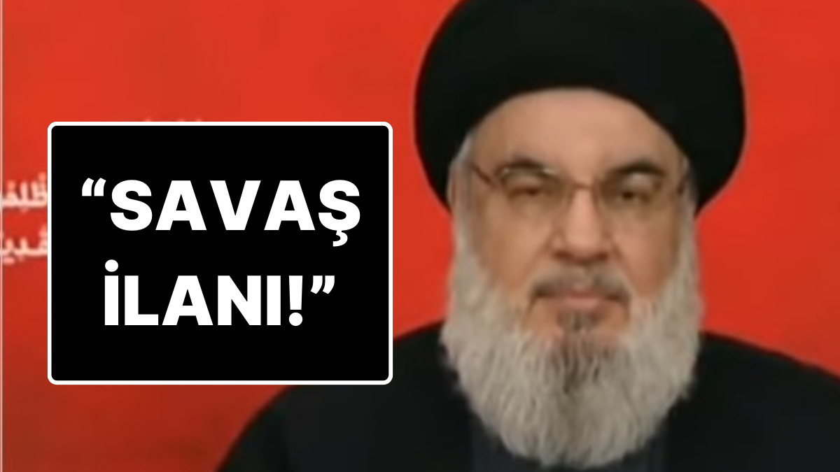 İntikam renkleri olan kırmızı arka planla konuşan Nasrallah; “İsrail dakikalar içinde 5 bin kişiyi öldürmeye çalıştı. Bu bir savaş suçu veya savaş ilanı.” ifadelerini kullandı.