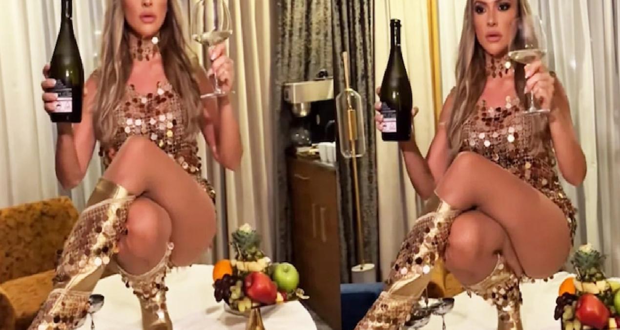 40 yaşındaki şarkıcı da tespih ve hurmanın olduğu masanın üzerinde bir yandan elinde şarap kaldırırken diğer yandan topuklu ayakkabılarıyla dengede kalmaya çalıştı.