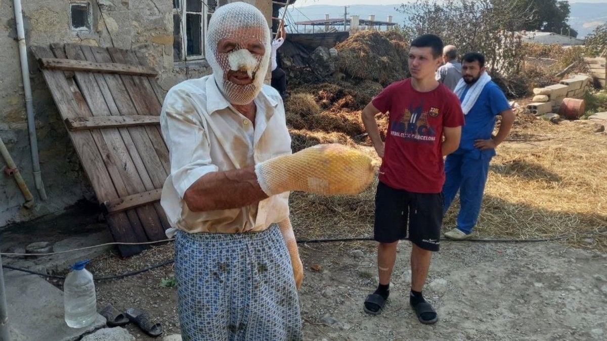 Demir, ormandan ateşin sıçramasıyla alev topuna dönen ahırında hayvanlarını kurtarmak isterken yaralandı. Yüzünde ve ellerinde yanıklar oluşan Demir, hastanedeki tedavisinin ardından yaralı yerleri sargılı şekilde köyüne döndü.