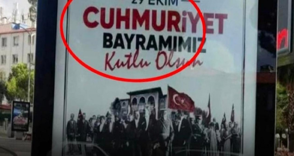 Cumhuriyet Bayramı yaklaşırken Muğla’da dikkat çeken bir olay yaşandı. Muğla Valiliği tarafından kentin çeşitli noktalarına asılan 29 Ekim afişlerinde “Cumhuriyet” kelimesinin “Cuhmuriyet” olarak yanlış yazılması sosyal medyada ve kentte tepki topladı