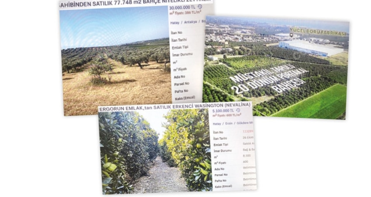 Yüksek üretim maliyetlerine karşılık düşen alım fiyatları ile geçen yıl başta limon olmak üzere bahçedeki ağaçlarını söken çiftçi bu yıl ise arazileri satılığa çıkardı. Deprem sonrası büyük göç veren ve Türkiye’nin en önemli üretim alanlarından biri olan Hatay’da çiftçinin artık üretim maliyetlerini karşılayamadığını kaydeden Antakya Ziraat Odası Başkanı Mehmet Muzaffer Okay, “Çiftçinin çözümü çiftçiliği bırakmak. Etrafımızda inanılmaz derecede satılık tarlalar var. Herkes bir şekilde toprağın bir kısmını satıp küçülme veya bu işin içinden çıkma peşinde. Bu bir tek Hatay’a mahsus bir olay değil. Türkiye’deki tüm üreticilerin sıkıntısı var. Kimle konuşsam tarla satmaktan bahsediyor” dedi. İlan sitelerinde ise onlarca dönüm arazi üzerindeki ağaç ve mahsullerle birlikte alıcı bekliyor. Hatay Dörtol’da 15 yıllık ağaçların olduğu portakal bahçesi 70 milyon TL’den satışa çıkarken, yine Hatay’da 30 dönümlük bir başka bahçe ise 115 milyon TL’den satışa sunuldu. Bir başka portakal bahçesi de 5 milyon 100 bin TL’den satılığa çıkarılmış durumda.