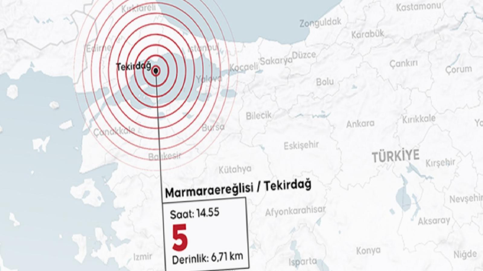 Tekirdağ Marmaraereğlisi açıklarında 5.0 büyüklüğünde deprem oldu. İstanbul’da da hissedilen depremin derinliği AFAD tarafından 6.71 kilometre olarak açıklandı. Kandilli Rasathanesi ise depremin büyüklüğünü 5.3 olarak açıkladı. İstanbul Valiliği, henüz hasar bilgisi alınmadığını saha ekiplerinin çalışma başlattığını duyurdu.