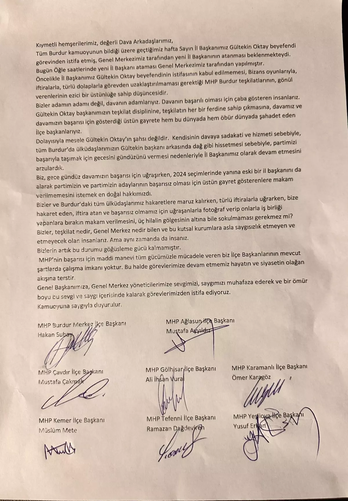 Biz, gece gündüz davamızın başarısı için uğraşırken, 2024 seçimlerinde yanına eski bir il başkanını da alarak partimizin ve partimizin adaylarının başarısız olması için üstün gayret gösterenlere makam verilmemesini istemek en doğal hakkımızdı. Bizler ve Burdur’daki tüm ülküdaşlarımız hakaretlere maruz kalırken, türlü iftiralarla uğrarken, bize hakaret eden, iftira atan ve başarısız olmamız için uğraşanlarla fotoğraf verip onlarla iş birliği yapanlara bırakın makam verilmesini, üç hilalin gölgesinin altına bile sokulmaması gerekmez mi? Bizler, teşkilat nedir, Genel Merkez nedir bilen ve bu kutsal kurumlara asla saygısızlık etmeyen ve etmeyecek olan insanlarız. Bizlerin artık bu durumu göğüsleme gücü kalmamıştır. MHP’nin başarısı için maddi manevi tüm gücümüzle mücadele veren biz ilçe başkanlarının mevcut şartlarda çalışma imkanı yoktur. Bu halde görevlerimize devam etmemiz hayatın ve siyasetin olağan akışına terstir. Genel Başkanımıza, Genel Merkez yöneticilerimize sevgimizi, saygımızı muhafaza ederek ve bir ömür boyu bu sevgi ve saygı içerisinde kalarak görevlerimizden istifa ediyoruz. Kamuoyuna saygıyla duyurulur.”