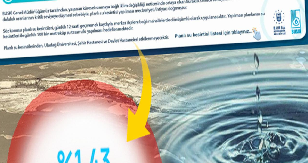 BUSKİ’den su kesintisi duyurusu geldi. Bu duyuruda: “su kaynaklarının azalması ve barajlardaki su seviyesinin kritik seviyeye düşmesi nedeniyle planlı su kesintisi yapılması mecburi olmuştur” denildi. Kesintilerle günde 100 bin metreküp su tasarrufu yapılması planlanıyor.