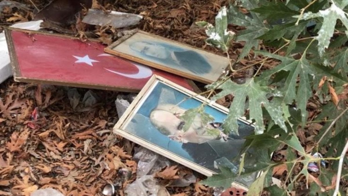 Taşıma sırasında okuldan alınmadığı anlaşılan çerçevelenmiş Türk bayrağı, Atatürk posterleri ile Atatürk’ün Gençliğe Hitabesi, bahçede çöplerin arısına atılmış durumda bulundu.