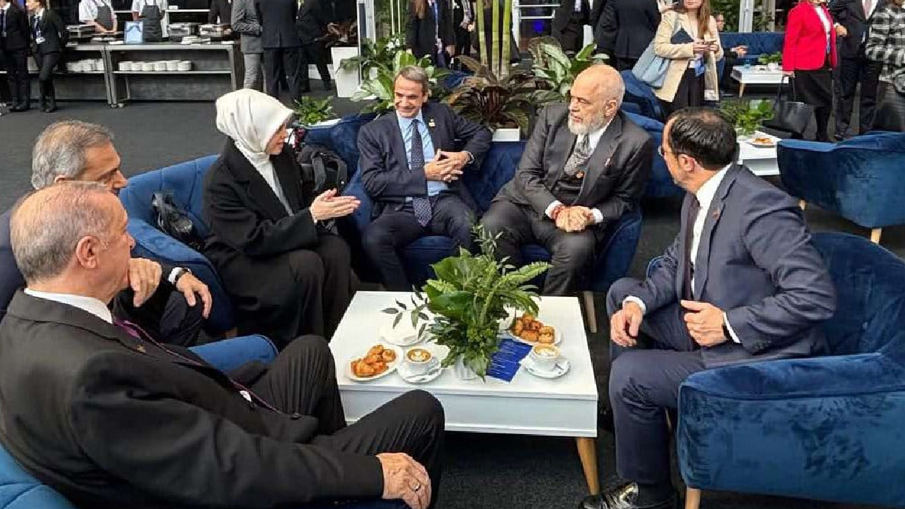Cumhurbaşkanı Erdoğan, Dışişleri Bakanı Hakan Fidan, Arnavutluk Başbakanı Edi Rama, Yunanistan Başbakanı Kiryakos Miçotakis ve Kıbrıs Rum Yönetimi Cumhurbaşkanı Nikos Hristodulidis aynı masada kahve içerek sohbet etti.