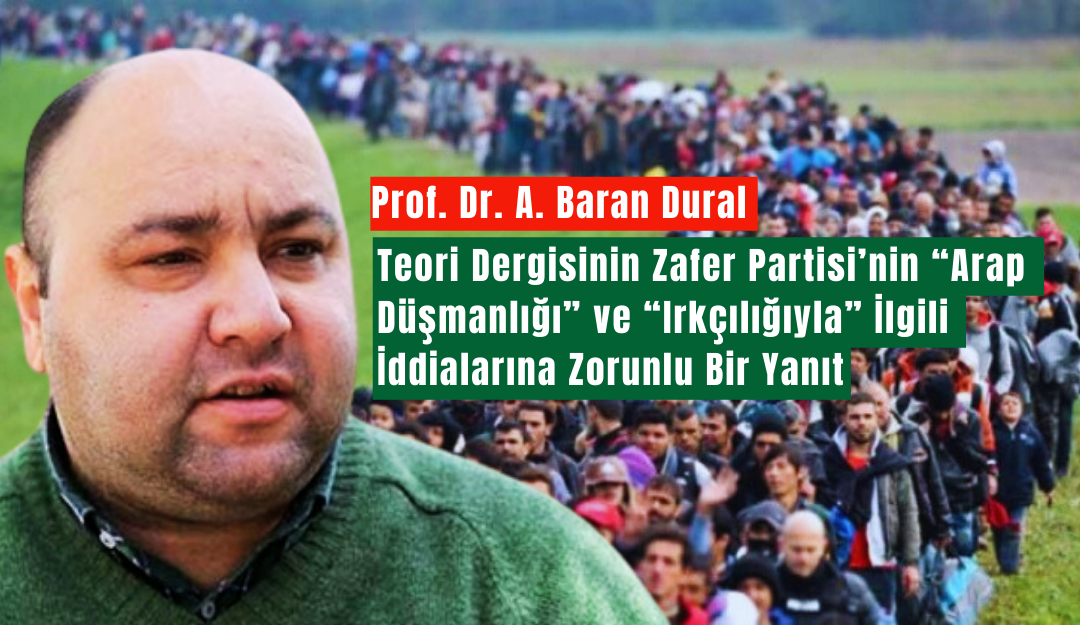 TC Trakya Üniversitesi SBKY Öğretim Üyesi ve Zafer Partisi Genel Siyasi İşlerden Sorumlu Genel Başkan Başdanışmanı Prof. Dr. A. Baran Dural Teöri Dergisi’nin Zafer Partisi’ni “Arap Düşmanlığı” ile suçlamasına 21. Yüzyıl Türkiye Enstitüsü’nün internet portalında yayınladığı bilimsel bir yazı ile cevap verdi. Dural’ın cevabı şu şekilde: