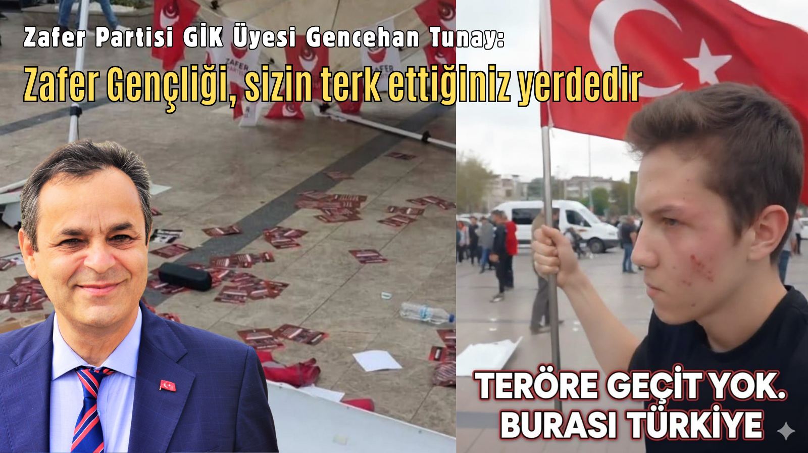Zafer Partisi GİK Üyesi Gencehan Tunay: “Türk’ün posteri elinde olan gence değil; Türk’ün düşmanına yumruk sıkılır. Ülkücülük; tabelaya değil, duruşa yazılır. Bir zamanlar milyonlarla “vatan bölünmez” diye haykırıyordunuz — şimdi o inanç nerede? Türk milliyetçiliğini ayaklar altına alanlara bile ses etmediniz.”